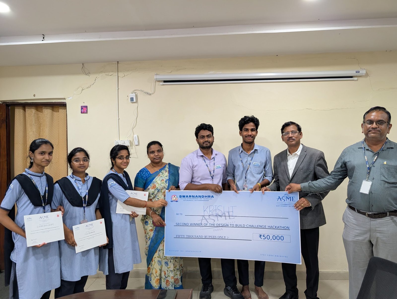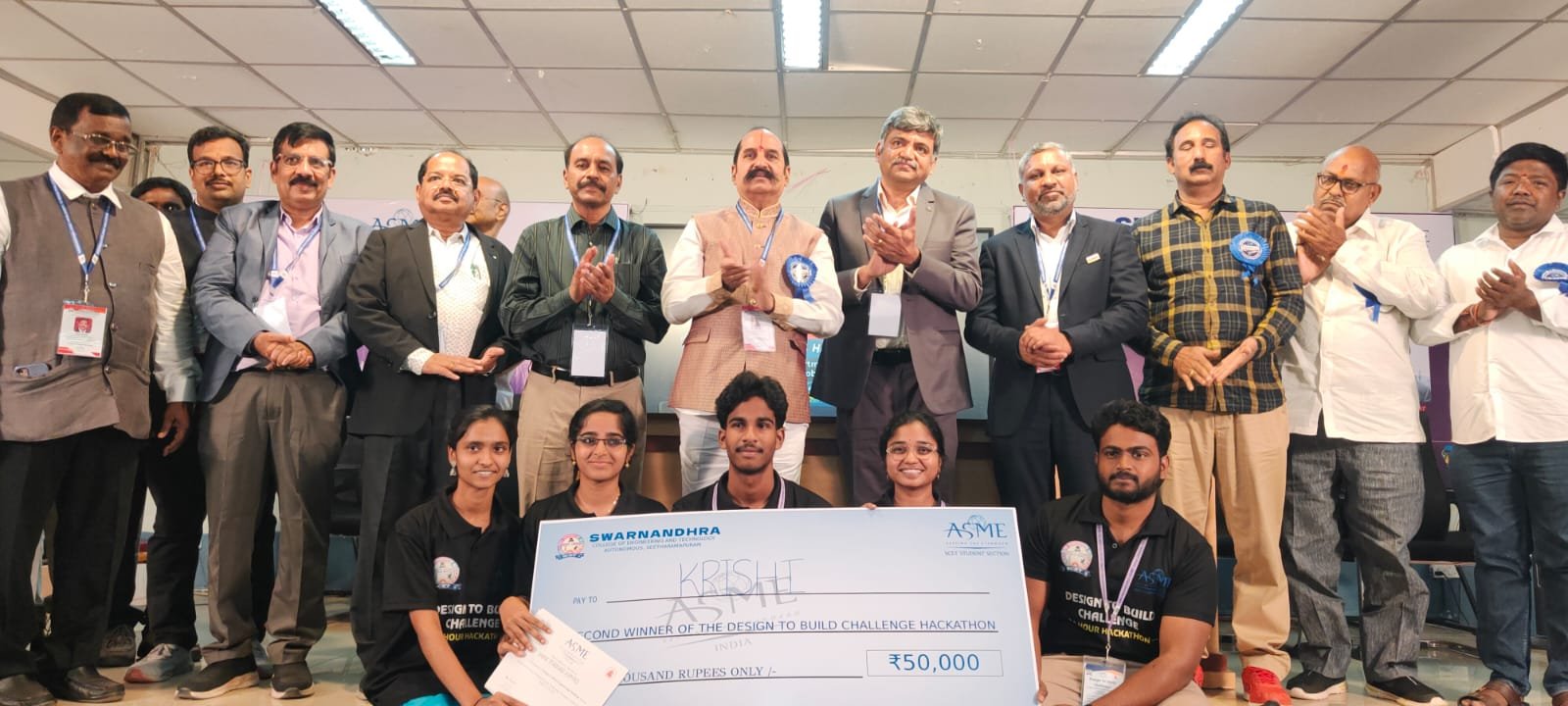 CSE – AI & DS students secured 2nd place in the ASME National Level Hackathon at Swarnandhra Engineering College, Narasapuram, and were awarded a cash prize of ₹50,000